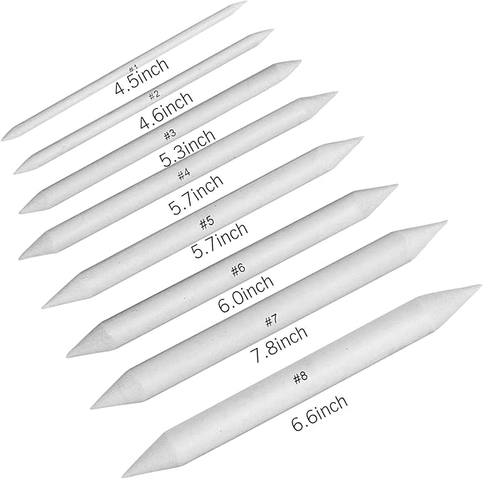 - DIFFERENT SIZES - Blending stumps set assorted size: #1, #2, #3, #4, #5, #6, #7, #8, each size 1 pc; Tortillion set size: #1, #2, #3, each size 3 pcs;This charcoal blending stumps and tortillion set can be sharpened by sandpaper blocks.Use them for blending pencil, pastels, and charcoal. Keep the stumps pointed by sharpening them with a sanding block
