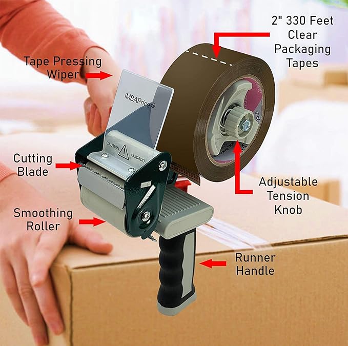 - Standard size roll fits any hand-held dispenser. Width: 2 inch. Length per roll: 110 yards. Thickness: 1.8 mil. It is approved for use with all major shipping carriers, including UPS, FedEx, DHL, USPS and more.