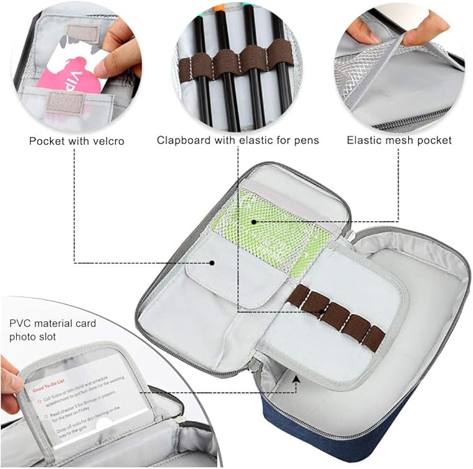 - 【PRAGMATIC CONSTRUCTION】: The inner velcro closed pocket can hold your cards, sticky notes or changes, The mesh pocket can keep your usb cable or ear buds well in place, The center hard flap with pen loops can hold 6 pieces frequently used pens for a quick access, The back of the flap with a transparent card/photo slot.