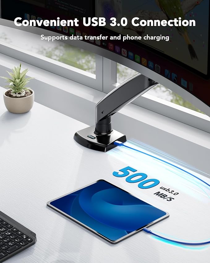 - USB INTEGRATION & DESKTOP MANAGEMENT:The built-in USB 3.0 port delivers 500MB/S data transfers and charging, while integrated cable channels reclaim 30% more desk space than fixed stands—ideal for minimalist setups.