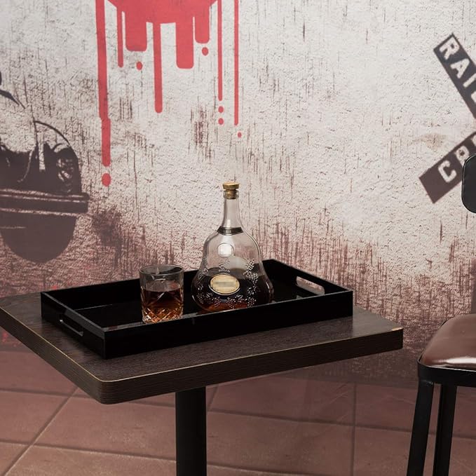 Glossy Black Sturdy Acrylic Serving Tray with Handles-12x20Inch-Serving Coffee,Appetizer,Breakfast,Butler-Kitchen Countertop Makeup Drawer Organizer-Vanity Table Ottoman Decorative Tray