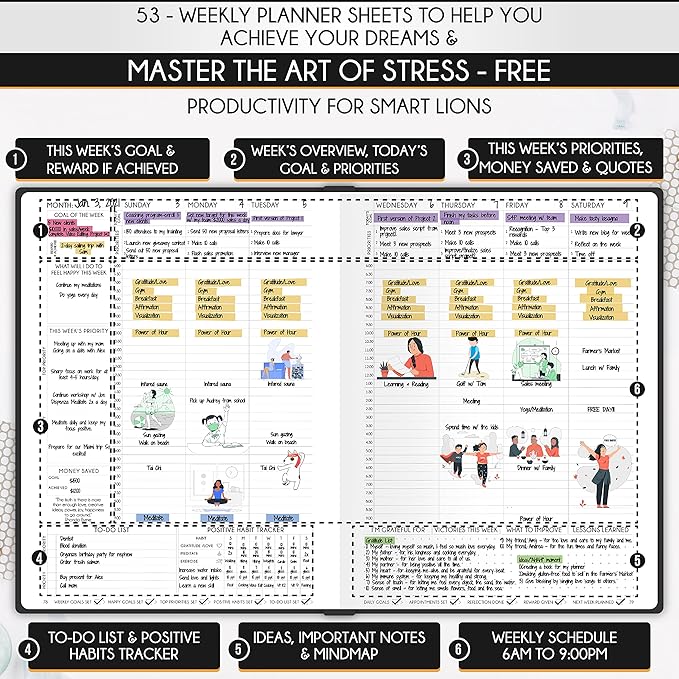 - LIFE PLANNER - A5 Size, 212 pages of life transformation, 53 weekly, 12 monthly planning overviews & reflection, 22 dotted journal pages, habit trackers, mind maps, morning & evening routines, inner pockets, pen holder & gift box