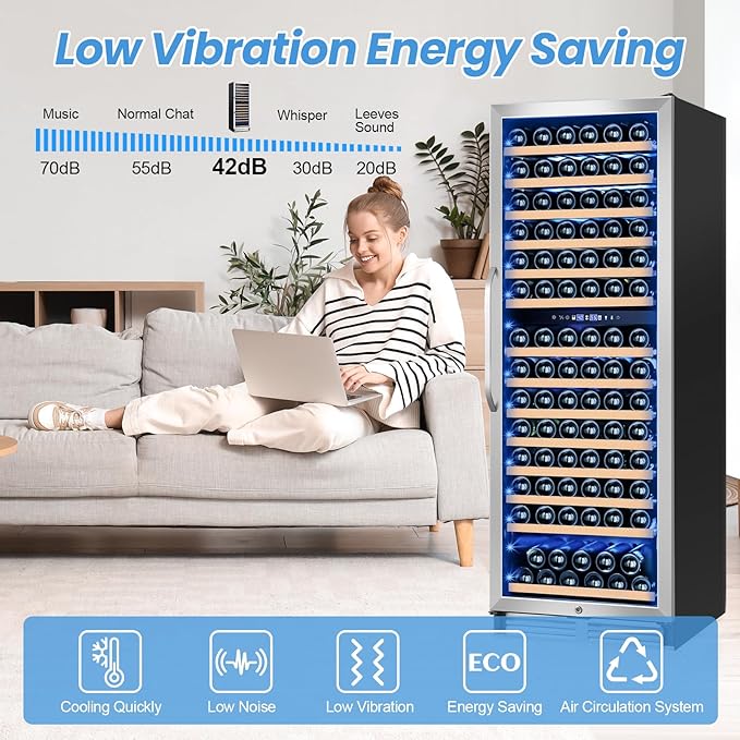 - 180 Bottles Capacity: The wine cooler can hold up to 180 standard wine bottles to meet your large storage needs; The adjustable and removable wooden shelves provide easy access and allow you to optimize your storage space according to your preferences