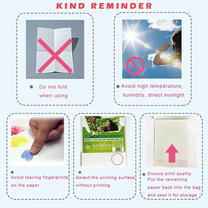 • 【Work with Inkjet Printer】 Premium glossy photo paper can only be used with dye-based ink printers. Single-sided printing, the back side can be written with a pen or ballpoint pen