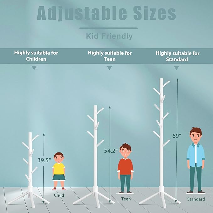 Haddockway Wooden Coat Rack Stand with 8 Hooks New Zealand Pine 3 Adjustable Coat Standing Tree Easy Assembly for Coats, Hats, Scarves and Handbags for Entryway, Hallway, Bedroom, Office, white