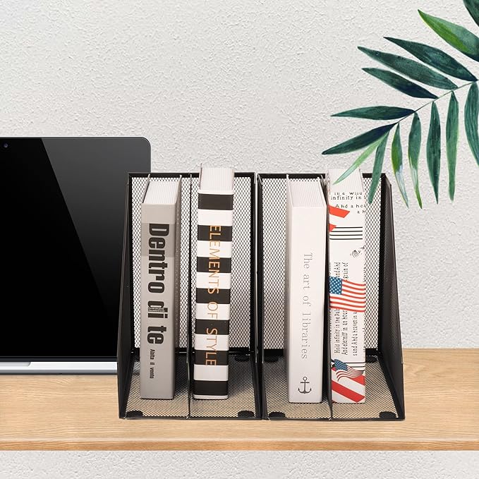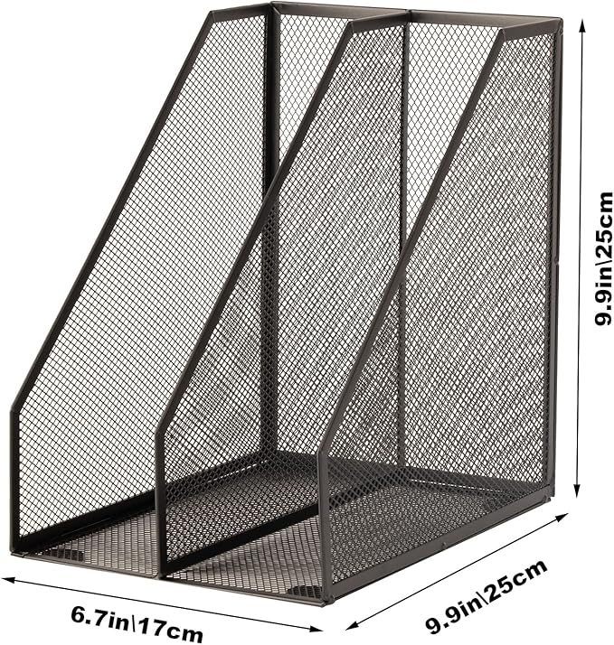 - 【MESH FILE HOLDER】: A set of 2 desktop magazine racks featuring a metal frame, and a wire mesh design. Use a magazine holder on your desktop, on shelves, in cabinets, on bookcases, and anywhere you need to keep paper organized.