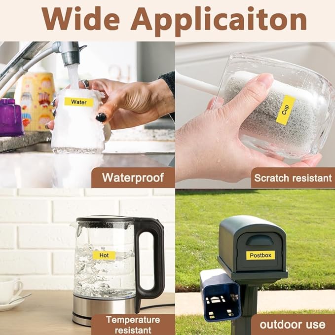 - Product features : Split back, water resistant, fading resistant, abrasion resistant, temperature resistant, strong adhesive. This compatibel 12mm tze-631 Black on Yellow label tape is suitable for indoor and outdoor use