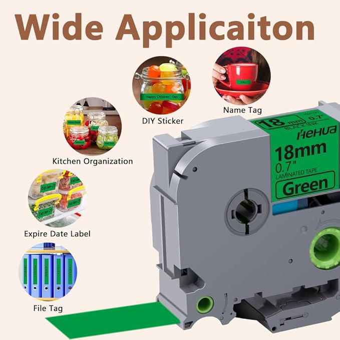- Size - 3/4" ( 18mm ) x 26.2' ( 8m ) each 18mm label tape. Color - Black letter on green tape