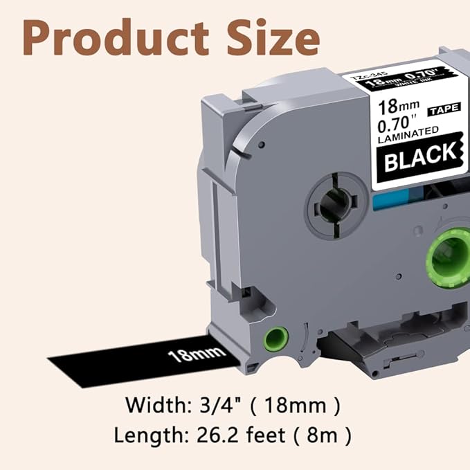 - Product features : Split back, water resistant, fading resistant, abrasion resistant, temperature resistant, strong adhesive. This compatibel label tape 18mm TZe-345 White on Black is suitable for indoor and outdoor use