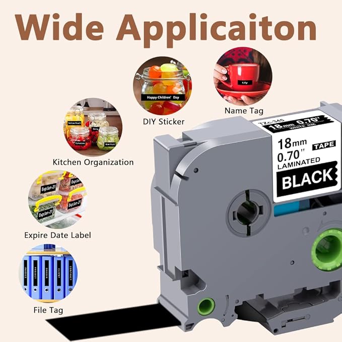 - Wide application: Compatible for Brother P-touch TZe 345 label tape is ideal to print clear, good-looking and durable labels. These labels are great for shelving, kitchen use, cabinets, file folders, USB sticks, food containers, storage boxes, personal possessions, children's school equipment with it's superior adhesive
