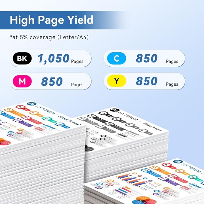 - Page Yield: Up to 1,050 Pages for 215A black toner cartridge, Up to 850 Pages for 215A color toner cartridges (Letter/A4, at 5% coverage)