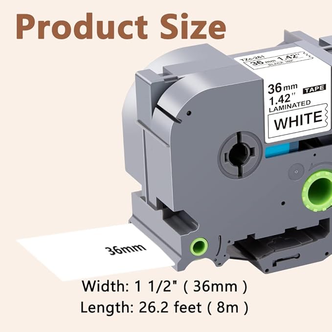 • Product features : Split back, water resistant, fading resistant, abrasion resistant, temperature resistant, strong adhesive. This compatibel label tape 36mm TZe-261 Black on White is suitable for indoor and outdoor use