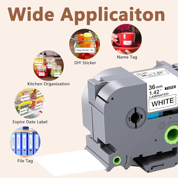 • Wide application: Compatible for Brother P-touch TZe 261 label tape is ideal to print clear, good-looking and durable labels. These labels are great for shelving, kitchen use, cabinets, file folders, USB sticks, food containers, storage boxes, personal possessions, children's school equipment with it's superior adhesive