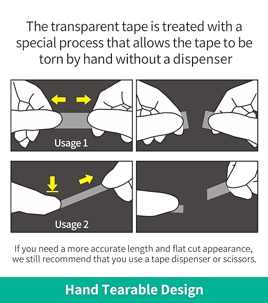 • HAND TEARABLE: Easy to tear by hand design, the tape rolls can be tear off by hand without dispenser. If you need a more accurate length and flat cut appearance, we still recommend that you use a tape dispenser or scissors.
