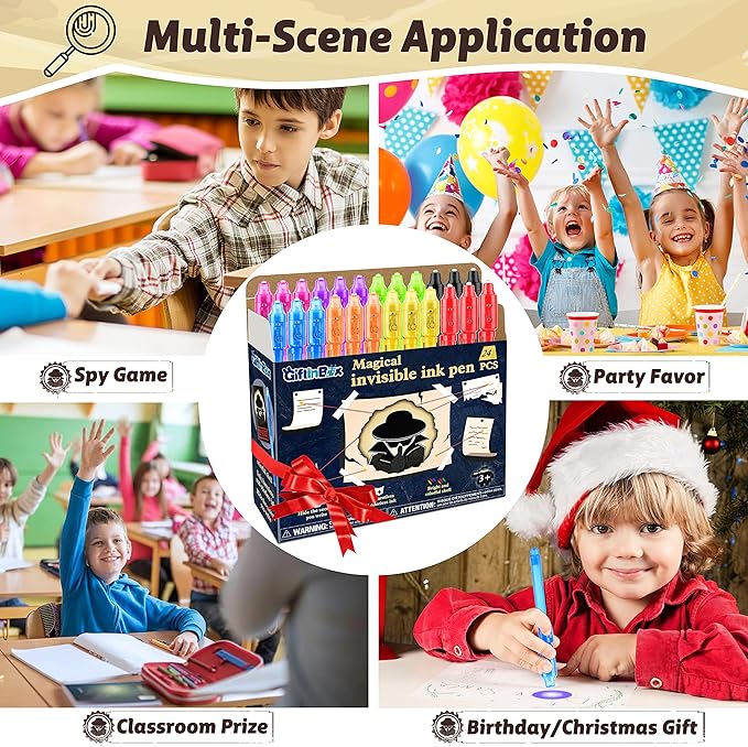 - Awesome Kids Party Favors - These glow in the dark party supplies are an ideal and unique kids party favors for kids 8-12. Suitable for any occasions like birthday parties, classroom prizes, or goodie bag stuffers. Perfect spy kit for games like the escape room, spy games, riddles, skin tattoos, etc. Whether you’re looking for a game for your kids or organizing a spy party, this invisible ink pen set will provide hours of entertainment.