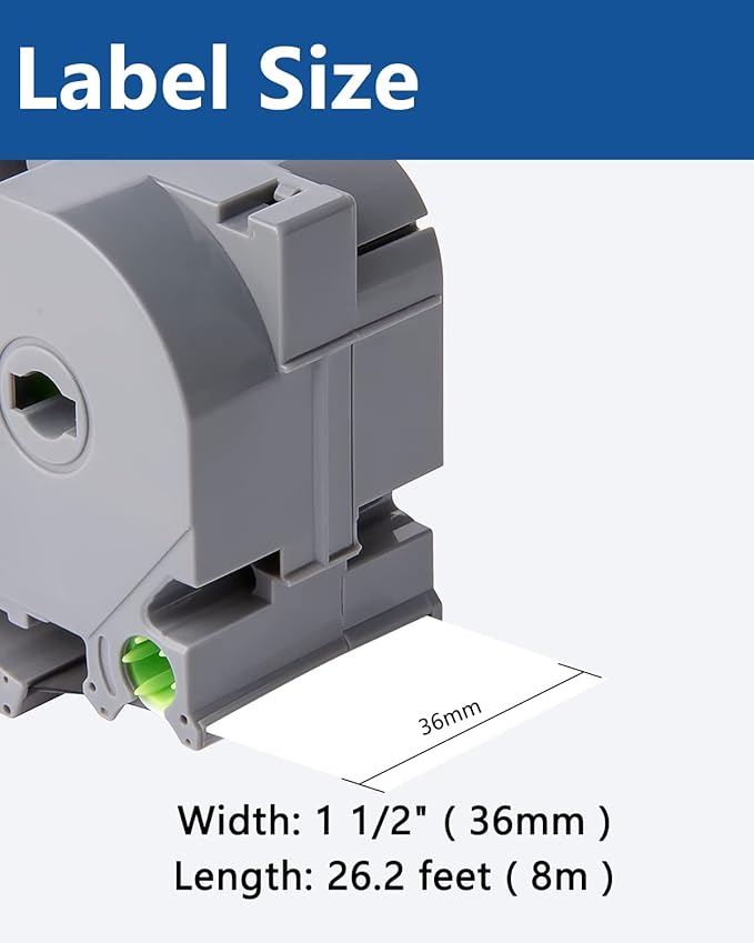• Size - 1 1/2" width x 26.2' length ( 36mm x 8m ) each 36mm clear label maker tape. Color - Black ink on clear tape