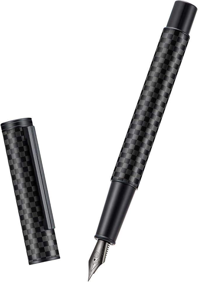 Hongdian 1861 Black Forest Carbon Fiber Fountain Pen, Long Blade Nib Modern Design Smooth Writing Pen with Converter and Metal Pen Case Set