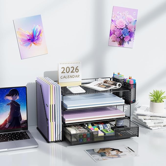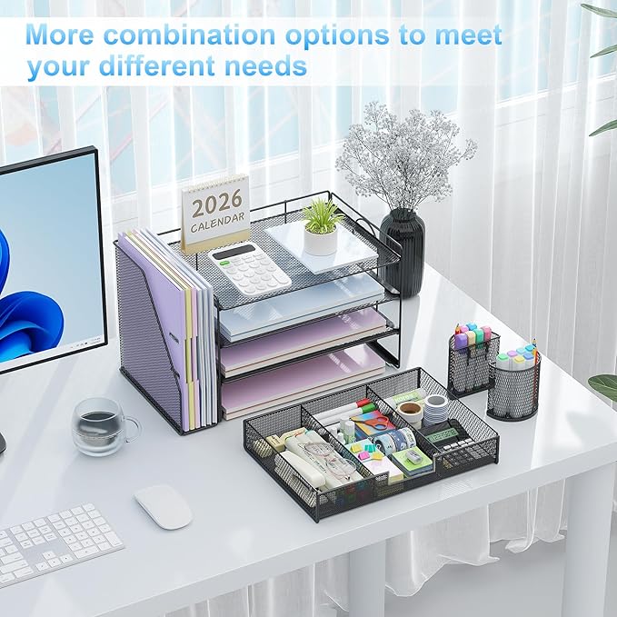 - 📂【Efficient Organization】: The office desk organizers has built-in 4 trays, a file organizer rack, 2 pen holders and a sliding drawer, which can help you quickly identify the storage content of each compartment, and a clean desktop makes you more creative.