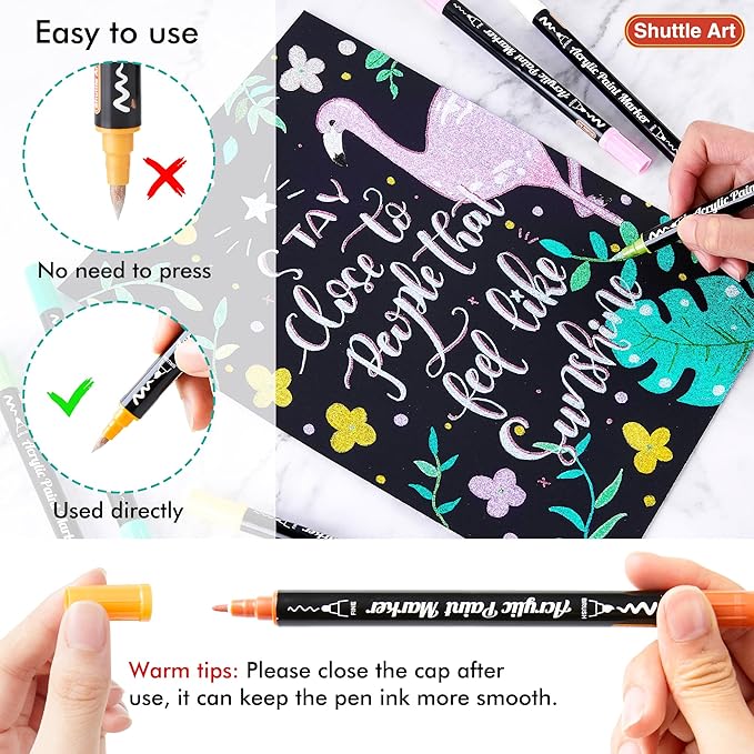 - 【UNIQUE DUAL TIP DESIGN】: Each acrylic paint marker come with a 1-5mm flexible fiber brush tip and 1mm fine tip, allows you to create medium or bold strokes by changing brush pressure and experience fine strokes with fine tip. Our tips are made of special fiber material which is wear-resistant, no branching and durable for a really long time.