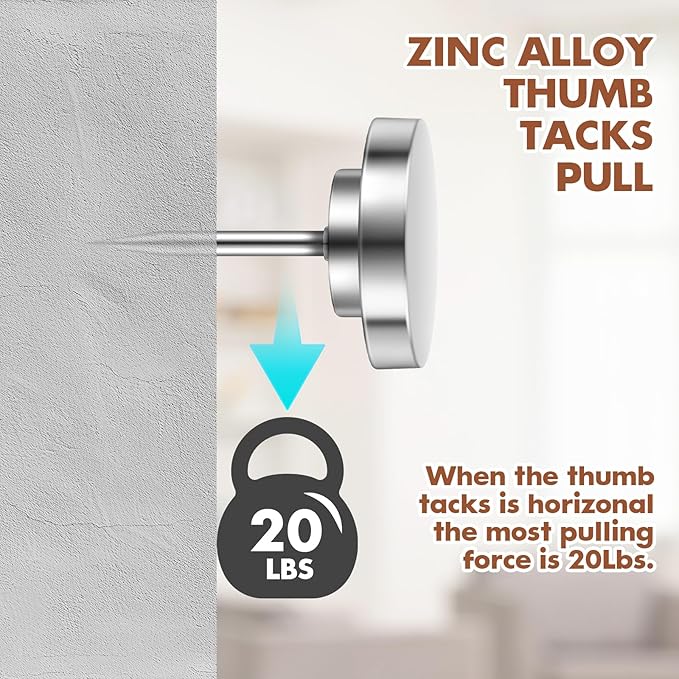- 【Durable Construction】The tacs measure approx. 0.6 inch in total length, and approx. 0.4 inch in diameter and they are made of zinc alloy, not easy to rust, are hard to deform, break, or fall off, and can hold up to 20 lbs. Lightweight but toughly made for daily use, great for both residential and commercial settings.