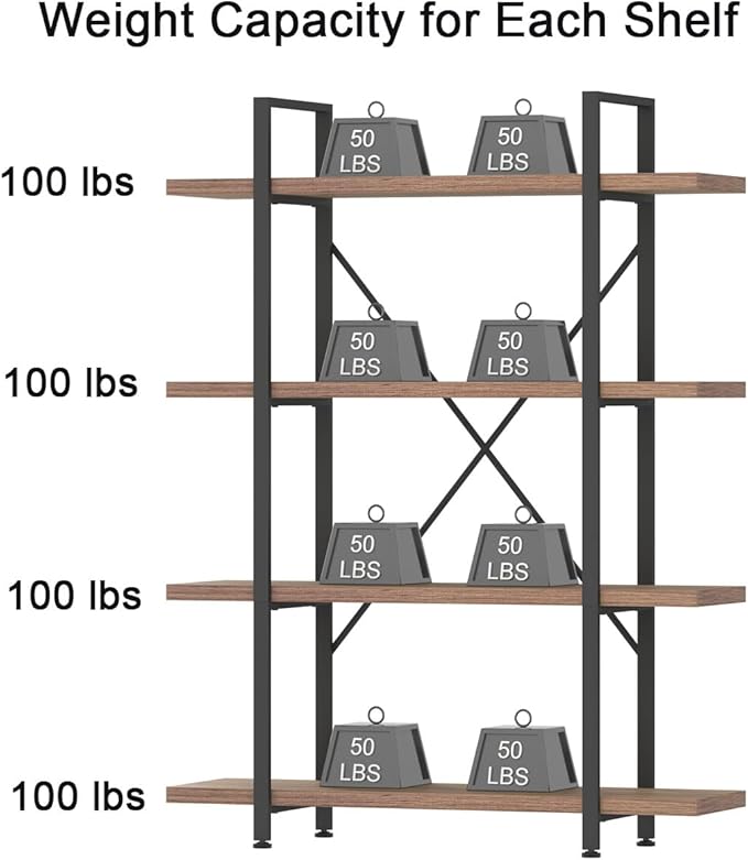 - 【Sturdy Construction】: Crafted from high-quality MDF board and thick steel metal frames, each shelf can support up to 100 pounds, making it a total weight capacity of 400 pounds for the rustic 4 shelf bookcase. Additional X-shaped reinforcement bars provide robust support for this wooden and metal book shelf, ensuring its stability and durability. The adjustable leveling feet on the storage book shelves help eliminate wobbling and prevent floor scratches.