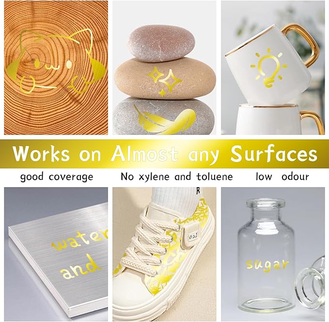 - Gold Paint Markers: Gold paint pens are made up of a long-lasting oil-based opaque ink, Low odor. The ink resists fading, water and abrasions, designed to stand out on both light and dark surfaces. Paint markers can be used on glass and once dry they will be permanent and waterproof
