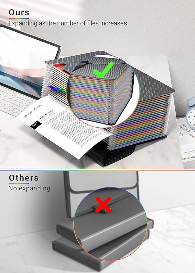 - ✔【ADVANTAGE】The lid of file folder organizer is designed with an extension line. The interior of file folders can be fully expanded and adjusted to the perfect position at will as more and more files are put in. It's definitely a useful and fashionable expanding file folders.