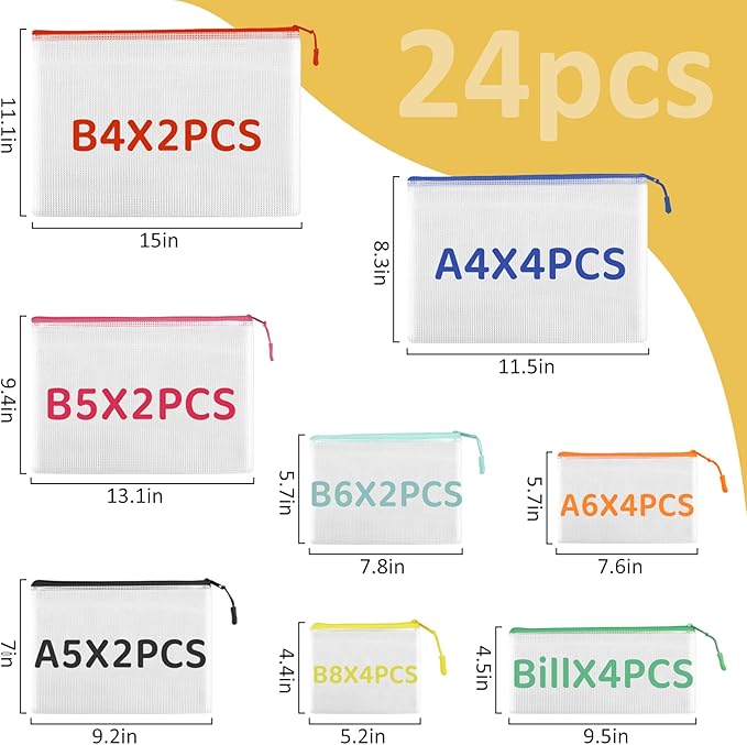 - PACKAGE CONTAINS:24pcs bag organizer: 2xB4 (15.6 x 11.2 inches), 4xA4 (13.6 x 9.6 inches), 2xB5 (11.6 x 8.4 inches), 2xA5 (9.4 x 6.8 inches), 2xB6 (7.8 x 5.6 inches), 4xA6 (7 x 4.8 inches), 4xBills (9.4 x 4.2 inches), 4xB8 (5.4 x 3.8 inches). Storage bags can be used to store teaching supplies such as pencils, books, rules, include handwork collection