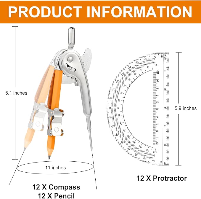 - Value Compass Geometry Tool Set: you will receive 24 pack geometry compass set, including 12 pieces of math compass with pencils and 12 pieces of geometric protractors, enough to meet your different work or study needs, and share with family or friends