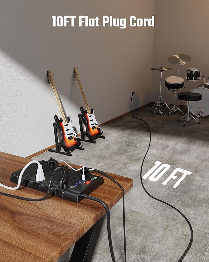 - 【10ft Thick Extension Cord】Our flat plug power strip comes with a 14AWG heavy-duty extension cord, capable of handling 1875W/15A maximum power required by running multiple appliances and electronics. Designed with a 45° flat plug, it will not block the bottom receptacle of your duplex wall outlet. As a gift, we include a hook & loop fastener to save you money on cable management.