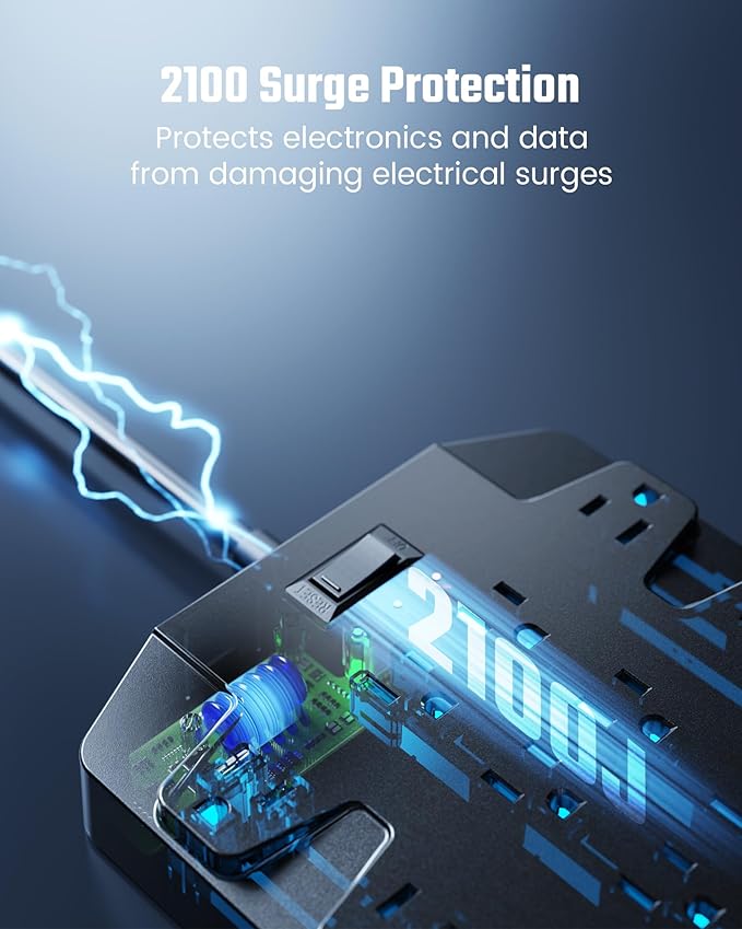 - 【All-Round Safety Protection】8-fold safety protection: 2100J surge protection, overload protection (15A), over-current protection, short-circuit protection, over-voltage protection, overheat protection, grounded protection, and flame-retardant (rated UL94 V-0, the highest level of fire resistance for casing materials). The power strip is fully compliant with FCC and RoHS safety standards, and reinforced with a UL-Recognized extension cord and flat plug. (1875W/15A)