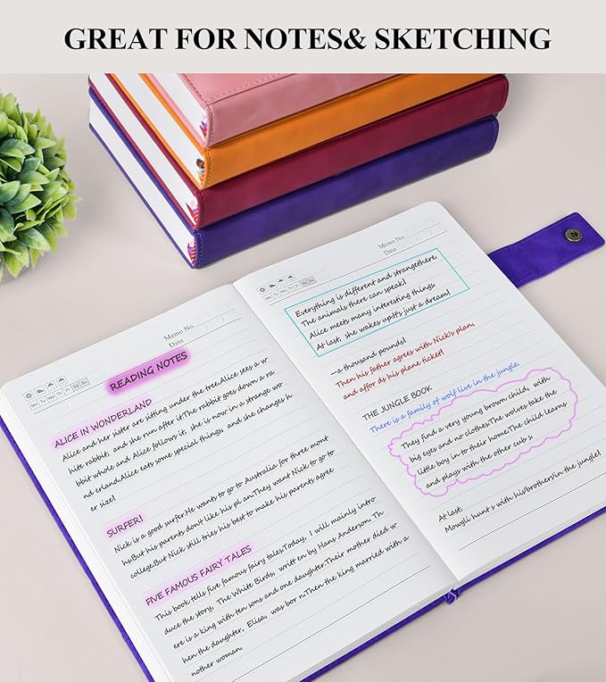 - 【CONVENIENT FEATURES FOR ORGANIZATION】:The leather journal includes 3 ribbon bookmarks, allowing you to easily mark important pages or sections. The 180° lay-flat design ensures that the notebook lies flat on any surface, making it comfortable to write in for extended periods. The metal snap closure design keeps the notebook securely closed, protecting your notes from damage.These features make the notebook a versatile tool for various settings, from work and school to personal use.