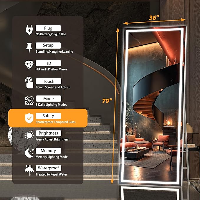 - 【Super Bright LED Floor Mirror】Adopt 180 LED beads strip, light more concentrated and brighter. Energy-efficient with 50,000 hours lifetime. Enhanced lighting sources designed to make the mirror bright enough for you to do makeup, skin care, shaving and dressing up. Super bright.