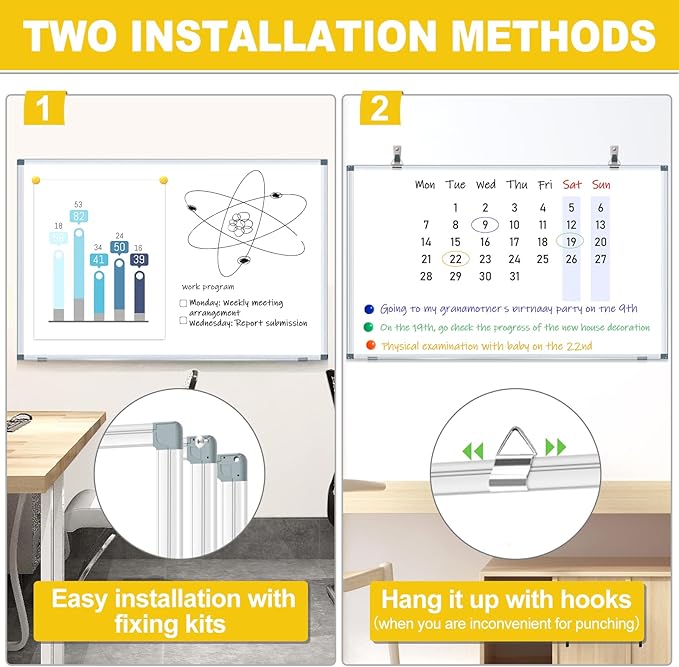 - 【Flexible Installation Choices】Tailor your installation with two convenient options. Mount the board by drilling holes in the wall and using the provided screws or use the hooks on the whiteboard for a drill-free hanging option. The movable hanging hooks allow easy adjustment of the hanging distance, providing installation flexibility. You can customize the orientation of the whiteboard horizontally or vertically to suit your space, with its classic design seamlessly complementing any decor.