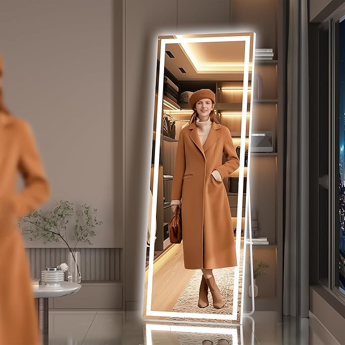 - 【Dimmable & 3 Color Temperature】This lighted full length mirror is multifunctional. You can press the button to change the color temperatures: Warm(3000K), natural (4000K) and white(6000K). You can also dim the brightness to your comfortable level. All these will be easily controlled by the touch button.