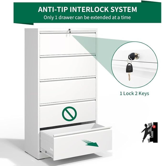 - 【Locking Cabinet for Security】This 5 drawer file cabinet with lock has an anti-tip design, which ensures that only one drawer can be opened at a time, preventing tipping and protecting your safety. The upgraded interlock system with 1 lock and 2 keys keeps your important documents safe.