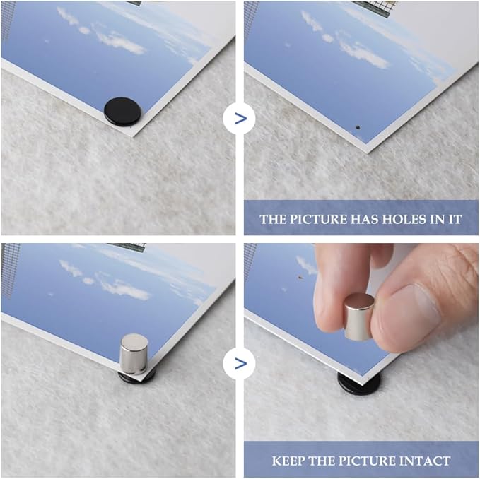 • 【Easy to Use】 You just push the pins into the wall with your hands, next position your photo, poster etc. that you want to hang, then hang your item by attaching the magnet to the outside