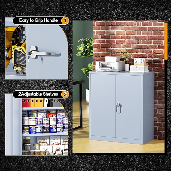 - [Excellent Space&Multipurpose]:Greenvelly metal storage cabinet(36"Hx16"D x32"W)and possess 2 adjustable Shelves and lock doors. The metal lockable cabinet is easy to adjust shelves.Each shelf could hold 180 lbs.Suitable space can be planned according to the size of the goods placed .Metal garage storage locking cabinet is suit for storing office files, sporting goods,groceries,gifts.