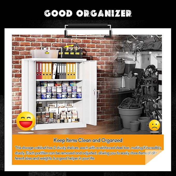 - [Excellent Material&Durability]:Greenvelly metal locking cabinet with doors and shelves is made up of 0.88mm cold-rolled steel plate.The surface of metal garage storage cabinet is coated with anti-corrosion and anti-rust coating,which makes it more durable and suitable for indoor and outdoor scenes,such as office,garage,home,school.