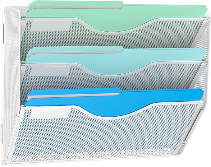 3 Tier Hanging Wall File Organizer, Mesh Mail Paper Orgnization Hanging File Folder Holder for Home Office, White