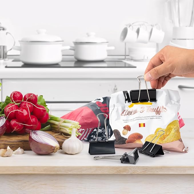 • Binder clips are ideal keeping organized of large stacks of loose paper securely fastened together and keep all foods air closed for office, home, school and crafts
