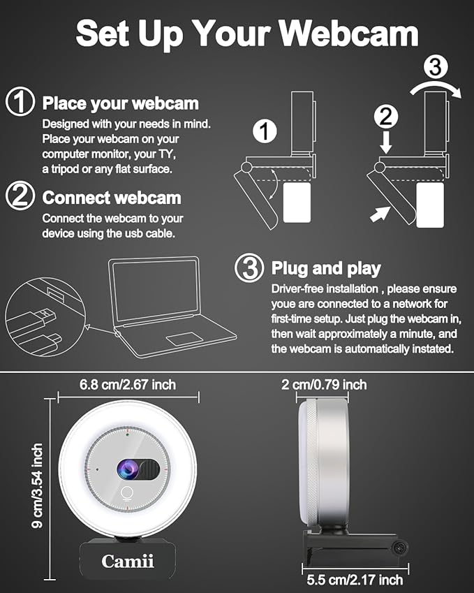 - [USB Plug & Paly]: The streaming webcam connects to PC/laptop using USB 2.0 port (no additional driver required). The high portability of the computer webcam is convenient for you to work on the go, the mounting clip can be flexibly placed on any desktop/monitor/laptop/Chromebook/PC/tripod for quick communication.