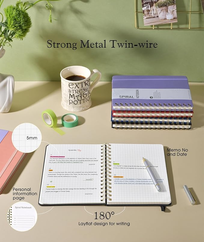 - 【Metal Twin-wire Construction】Our wire-bound spiral journal notebook has a sturdy gold-color double wire spiral with easy-to-turn pages and keeps pages attached reliably. Metal wire ring makes it easy to tear out pages without disturbing the rest of the pretty notebook. The 180°flat binding makes it easy to take notes with either hand, making it easier to read and more efficient to keep track of things.
