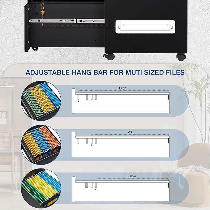 - LARGE CAPACITY DRAWER - The first drawer is equipped with a stationery storage box. You can put the frequent stationery used in this box; the bottom drawer provides a suspension file bar that can be moved. This file bar can accommodate letter, legal and A4 Documents. Guaranteed to make your file well organize.