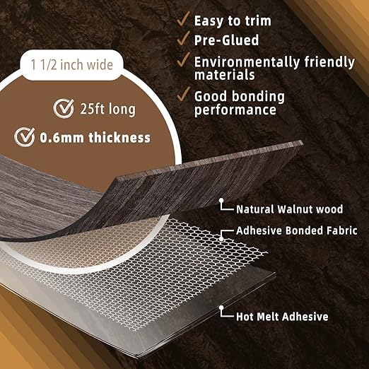 - √【HIGH QUALITY】- The edge banding is made of high quality real wood material, which is durable and elastic, with a smooth surface and not easy to be dirty.When you repair Laminate and Cabinets, Walnut Edge banding will be your first choice.