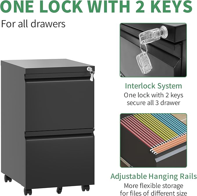 - 【Privacy Security】The 2 drawer file cabinet with wheels is equipped with 2 Keys, 1 lock secures all three drawers. It is the best choice for office and personal use, keeping your personal belongings and documents safe when you leave the office or home.