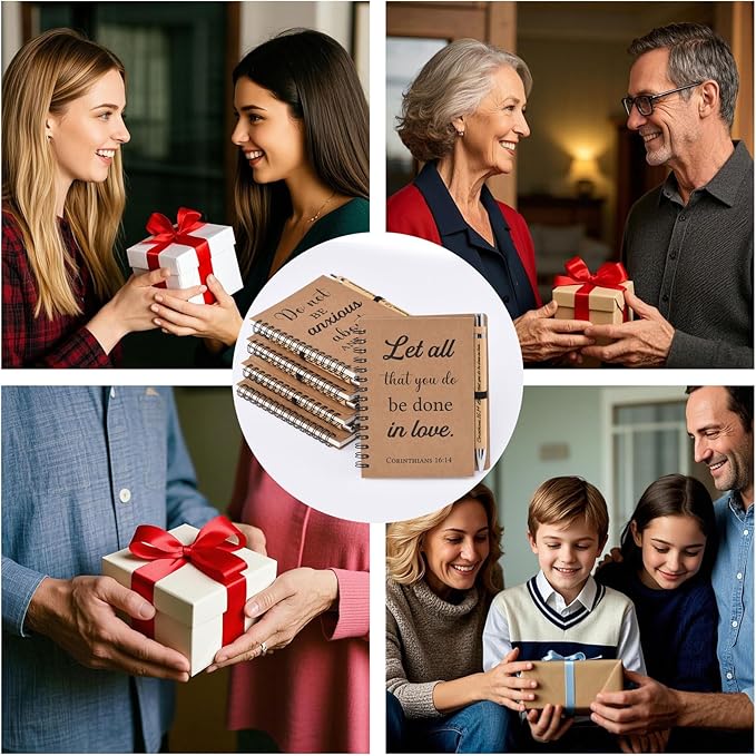 - Inspirational Scripture Notebook Set – This set includes 20 spiral notebooks and 20 bamboo pens, featuring 5 different Bible verses (4 notebooks and 4 pens per verse). A meaningful and practical bundle for note-taking, study, and gifting.