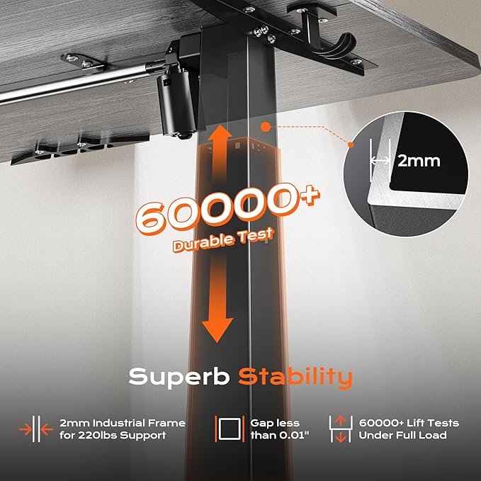 - 【Built to Last with Exceptional Stability】The industrial-grade steel frame and T-shaped design of the stand up desk support up to 220 lbs, ensuring stability and reliability for years to come. Paired with a durable motor, this home office desk is designed to meet the demands of your dynamic workday
