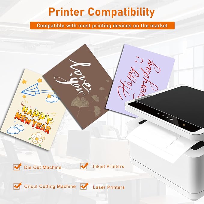 • ▶Printer Compatibility:our thick printer paper card stock is compatible with most types of laser printers, inkjet, die-cutting machines, and cricut cutting machines. Please ensure that your printer can print on 200gsm before ordering