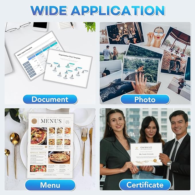 - Wide Application: This thermal laminating pouches is suitable for various scenarios and can be used to save files, photos, menus, recipe cards, certificates, etc. It can be used in classrooms, homes, and offices